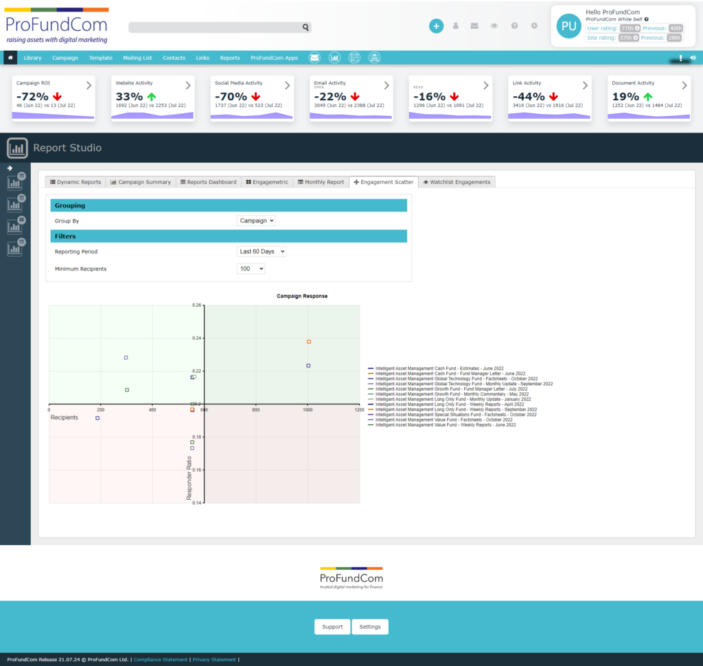 Description: An additional section has been created for scatter charts. These reports allow clients to see the relative performance of communications and campaigns over time mapped against the following criteria.
